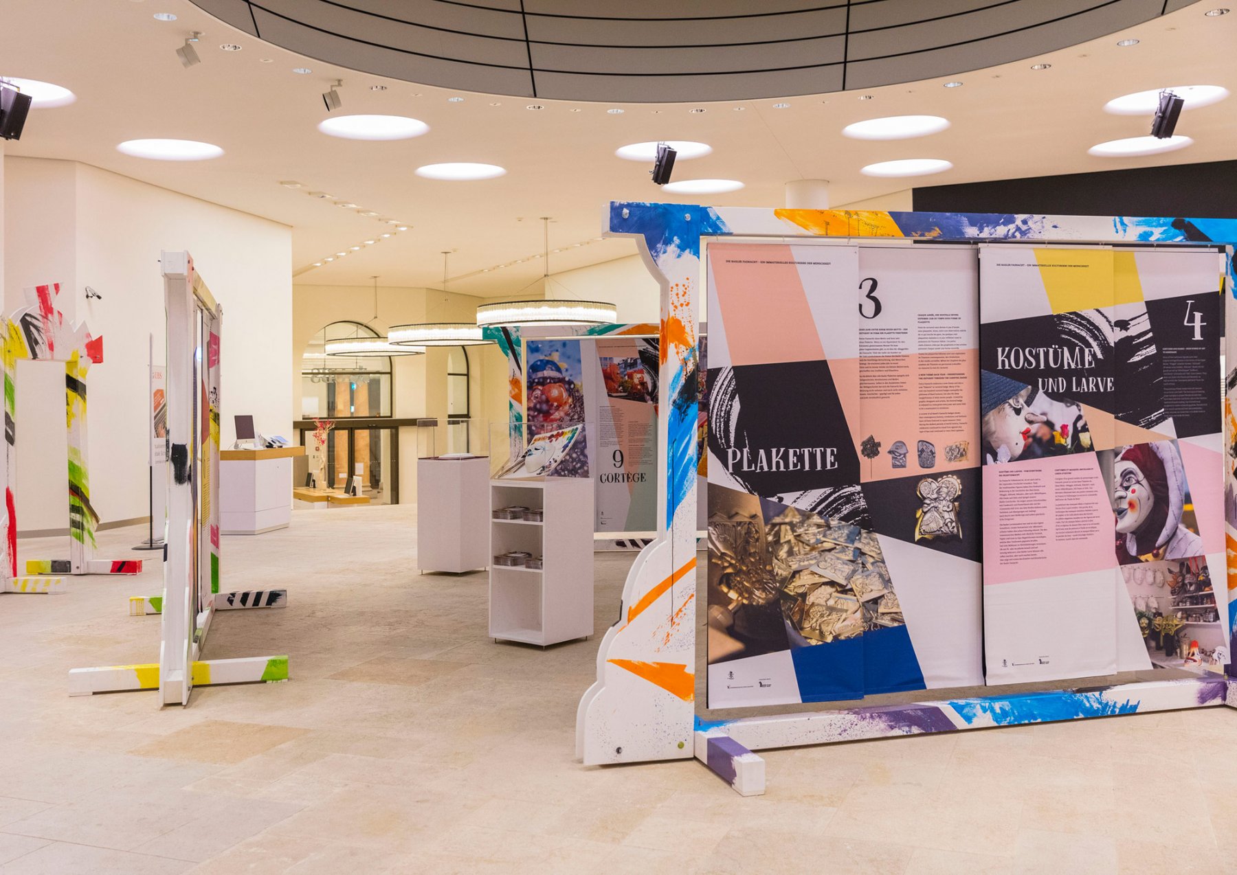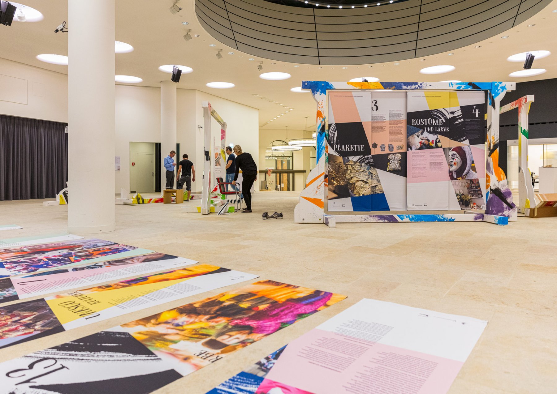 Die Basler Fasnacht ist ein Sonderfall unter den weltweit zelebrierten Fastnachten oder Carnevals. Nicht pure Lebensfreude oder das Feiern des nahenden Frühlings war der Auslöser dieses erst zu Anfang des 20. Jahrhundert voll ausgebildeten Brauches, sondern der politische Unmut der Bevölkerung gegen die rigiden protestantischen Restriktionen im Alltag. Die bis heute politisch ausgerichtete Basler Fasnacht wurde 2018 in die Liste der immateriellen Kulturgüter der Menschheit aufgenommen. Aus diesem Anlass gestalteten wir eine sehr virtuelle und spielerische Infrastruktur, die je nach Anlass immer wieder anders aufgestellt werden kann. Die nur aus Stoffbahnen bestehenden Bilder und Illustrationen sind eine Analogie zur Immaterialität des Themas.