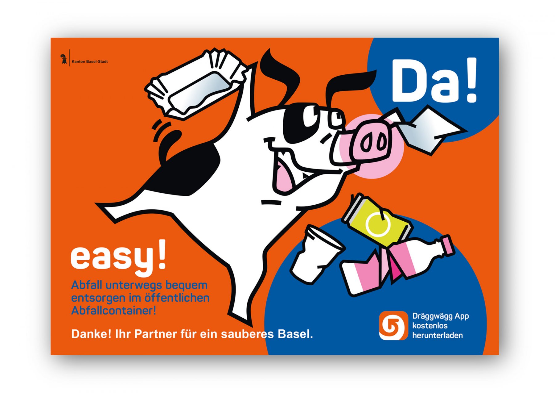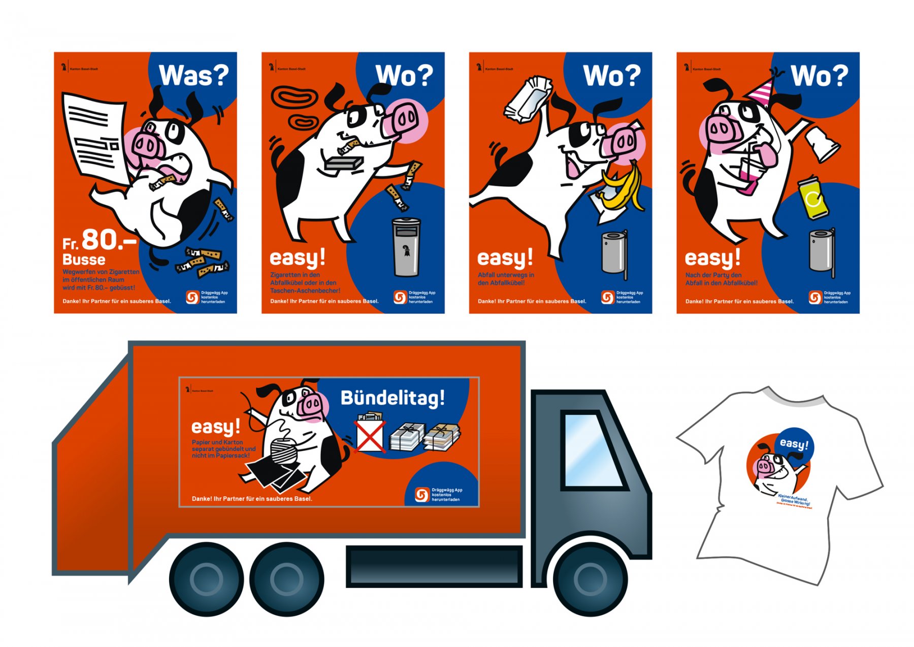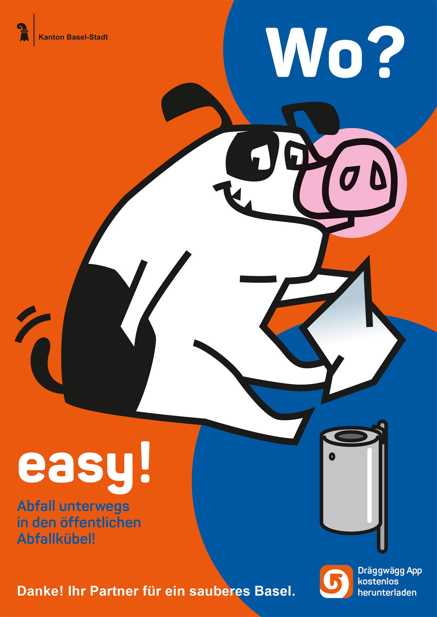 Manchmal muss man die Dinge beim Namen nennen. Die Kampagne des Kantons Basel-Stadt von 2018 bis 2020 gegen Littering auf den Strassen zeigt klar und deutlich die Ursache für den herumliegenden Abfall. Der «innere Schweinehund» sagt einem zuweilen, dass man nichts auf den Boden werfen sollte, aber man tut es eben doch. Mit der humorvoll verstandenen Figur des Schweinehundes wurde intensiv und auf vielen Medien kommuniziert. Mittlerweile kennt diese Ikone jede Baslerin und jeder Basler.